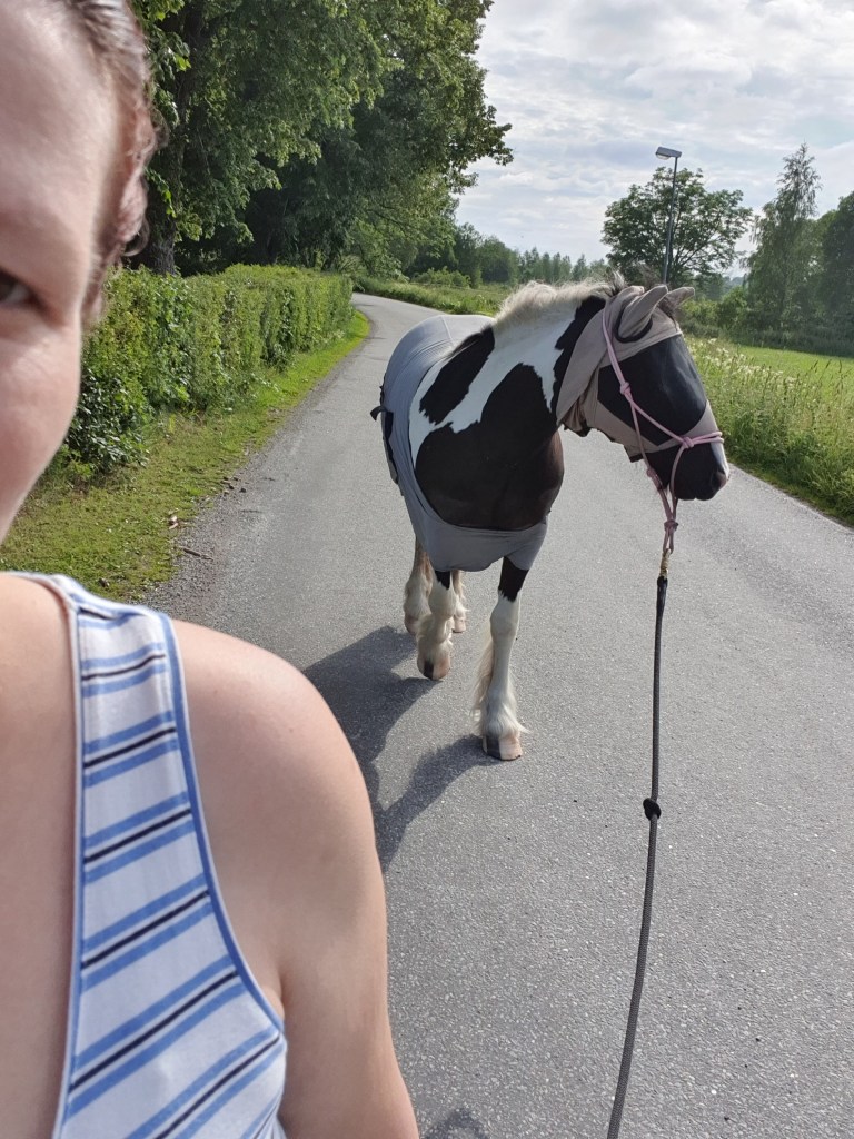 Men allt gick hur bra som helst, Loke sov i princip hela tiden. Jag tog in Rut, tränade på att borsta, lyfta hovar, skulle jobba lite på rundvolten men hon har blivit lite lat under betet, det var dessutom jättestora hästbromsar så vi gick in igen och i stället tränade vi på att duscha i spolspiltan och ja efter ett tag så accepterade hon att bli duschad med vattenslangen 💞