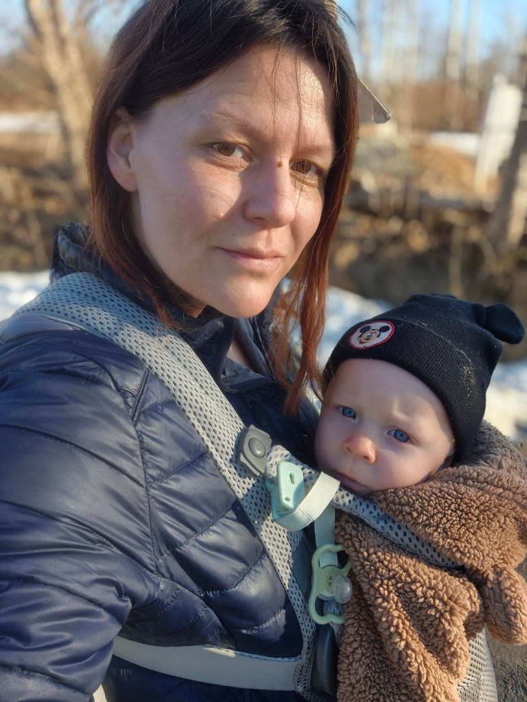 Denna mmorgon började jag med att släppa ut hästarna med Loke i bärselen på magen, gick hur bra som helst.