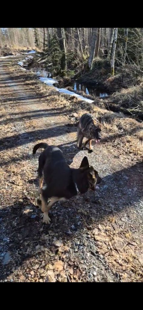 Idag har det varit underbart vårväder, vi var och träffade en syster till Fuji, först var, Fuji livrädd, tills vi kom på allmän plats där ingen hade revir, då gick det bra och dom började busa och röjde runt.
